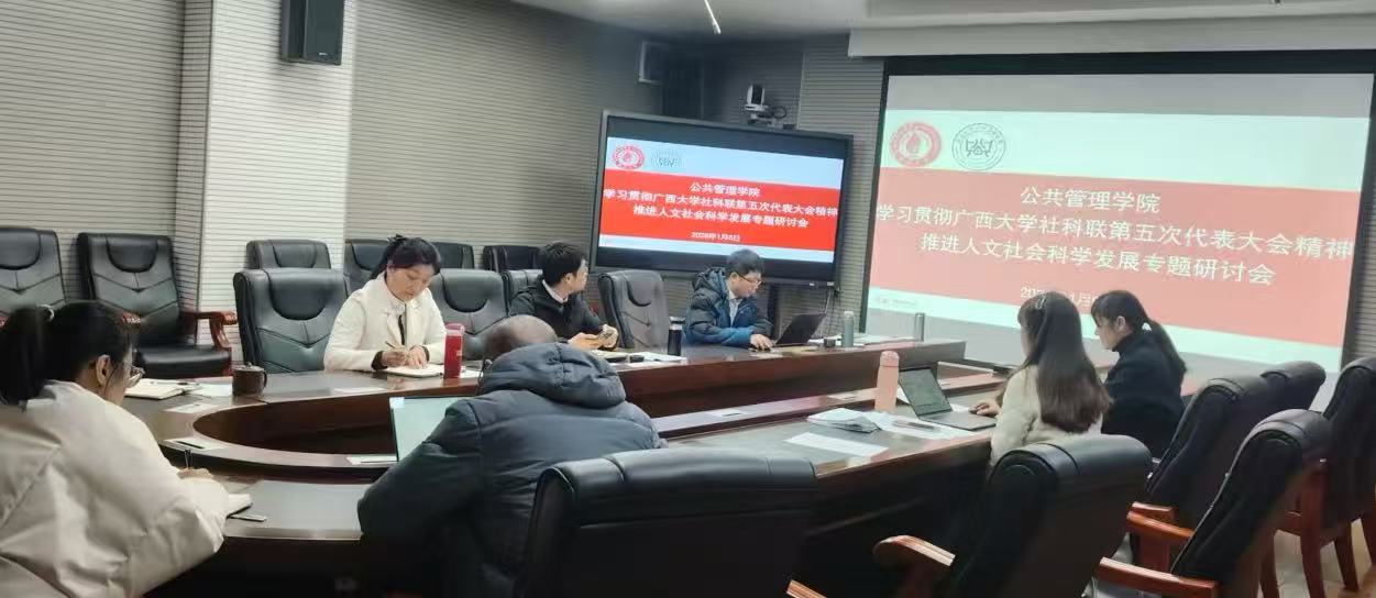 近日,广西大学公共管理学院领导班子召开专题会议,深入学习贯彻学校社科联第五次代表大会精神。会上,学院对照《广西大学推进人文社科高质量工作目标任务分解表》,结合发展实际细化落实举措,部署“十五五”时期重点工作,以学促干、守正创新,推动学院人文社科高质量发展的共识与合力。