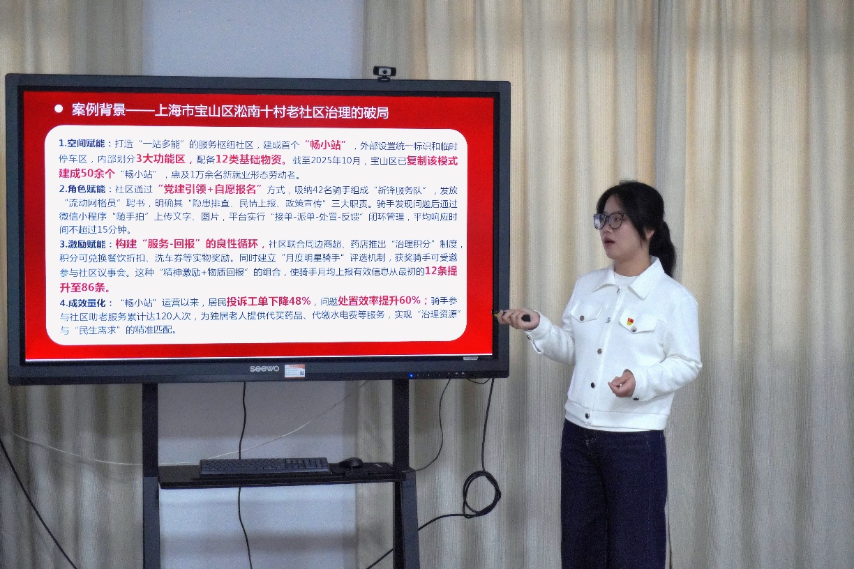 随后,支部书记于丹围绕“破译党的二十届四中全会里的公共管理密码”进行专题导学,为实践研讨奠定理论基础。在案例成果展示环节,四个小组依次汇报了本组运用党的二十届四中全会精神分析破解基层治理难题的实践成果。各小组聚焦新就业群体党建、公共空间治理、基层数字赋能、大数据核查“机械清退”等前沿议题,展示了AI技术辅助下的创新分析路径与解决方案,研讨过程充分体现了党建与业务的深度融合。