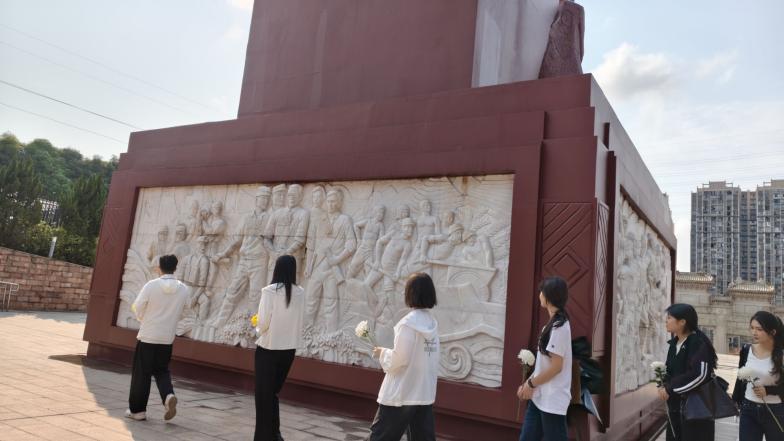 默哀结束后,《献花曲》响起,我院同学缓步抬送花篮走向烈士纪念碑,将花篮郑重敬献于碑前,陈科旭老师上前整理花篮缎带。随后全体师生有序瞻仰烈士纪念碑,深切感悟革命先烈的奉献精神。