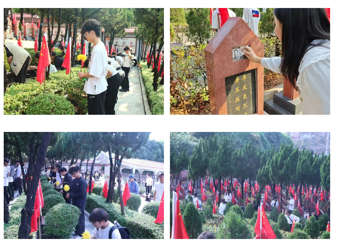 随后,全体师生开展自主瞻仰与祭扫活动。我院学子手持湿巾,小心翼翼地擦拭烈士墓碑,拂去碑面浮尘,将手中的菊花敬献于烈士碑前,以朴素的行动表达对革命先烈的敬仰与追思,部分同学驻足细读碑文,追忆先烈的英勇事迹。
