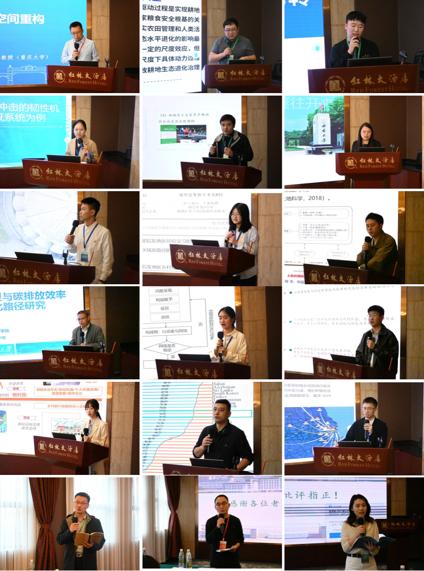 “土地利用转型与社会空间重构”分论坛在四楼贵宾三号会议厅举行,由中山大学杨忍教授与北京市农林科学院刘玉研究员主持和点评,重庆大学马历副教授与中国科学院地理科学与资源研究所曹智副研究员参与点评。分论坛邀请了中国科学院地理科学与资源研究所曹智、中国地质大学(武汉)瞿诗进、西南大学周洪、中国地质大学(武汉)曾杰、成都理工大学张兰心、宁波大学王硕、广西大学谭林、南京农业大学孙昊、广州大学吴大放、中国矿业大学隋虹均、浙江农林大学冯德东、广西大学郭贝儿、同济大学黄龙颜、华南农业大学蔡怀滨、四川大学张子怡等学者。论坛聚焦土地利用转型的多元路径及其对社会空间结构的深远影响,围绕乡村土地利用转型、城市土地混合利用与社区韧性、森林转型、耕地扩张、城乡要素流动、乡村社会空间重构、土地利用隐性转型、土地资源配置与绿色生产效率等多个维度展开了深入的研讨和交流。