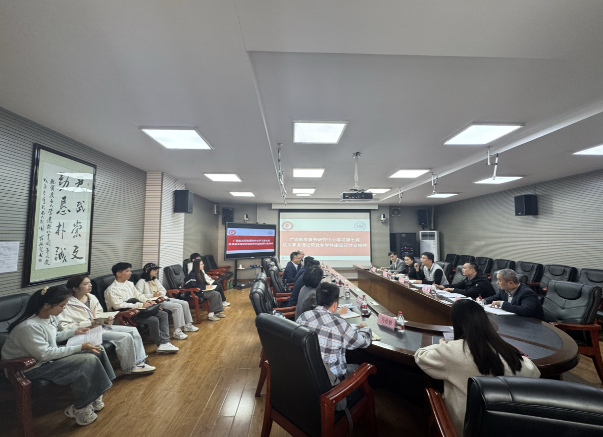 2025年11月24日,广西机关事务研究中心在广西大学公共管理学院召开会议,学习第七届机关事务理论研究和学科建设研讨会精神。自治区机关事务管理局政策法规处、办公室、广西大学公共管理学院等广西机关事务研究中心相关同志参加会议。