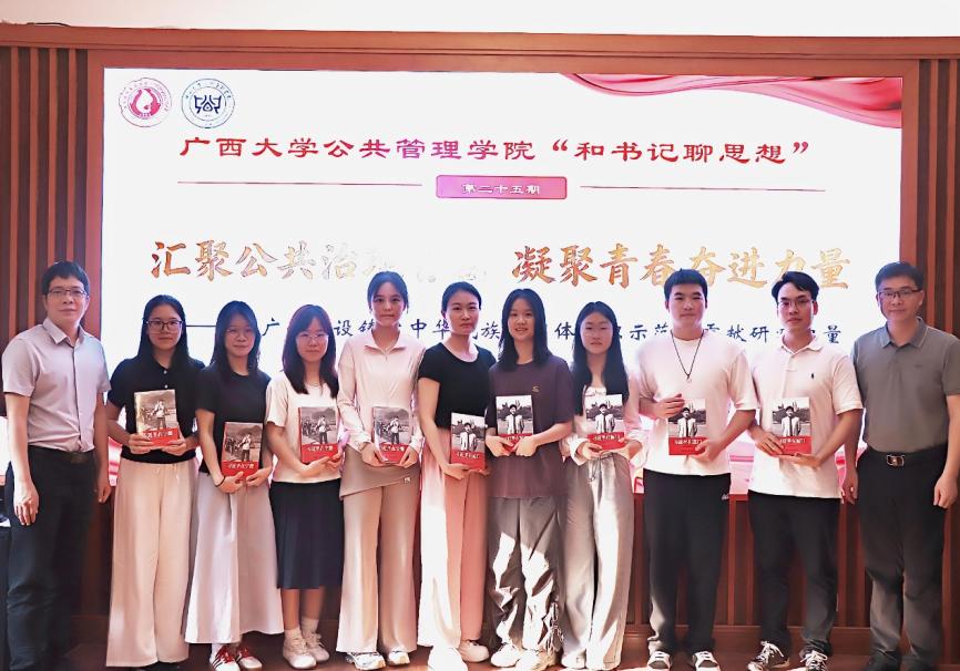 唐旭彬在总结发言中对西大公管学子提出三点期望:一是深学习近平总书记关于铸牢中华民族共同体意识的重要论述,筑牢思想根基,提升政治素养;二是深耕公共管理专业,钻研学问、紧扣前沿,做到知行合一,练就过硬本领;三是深扎八桂大地,立足广西所需,为广西建设铸牢中华民族共同体意识示范区和广西高质量发展贡献研究力量和青春力量。