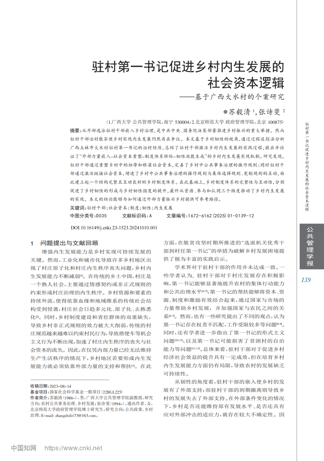 2026年4月11日,在《公共管理学报》编委会年度会议暨智能社会公共管理研究方法学术研讨会现场,以不记名投票方式选出10篇优秀论文。其中我院教师苏毅清、全日制MPA硕士(现于北京师范大学政府管理学院攻读博士)张诗斐撰写的论文《驻村第一书记促进乡村内生发展的社会资本逻辑基于广西大水村的个案研究》荣幸入选。