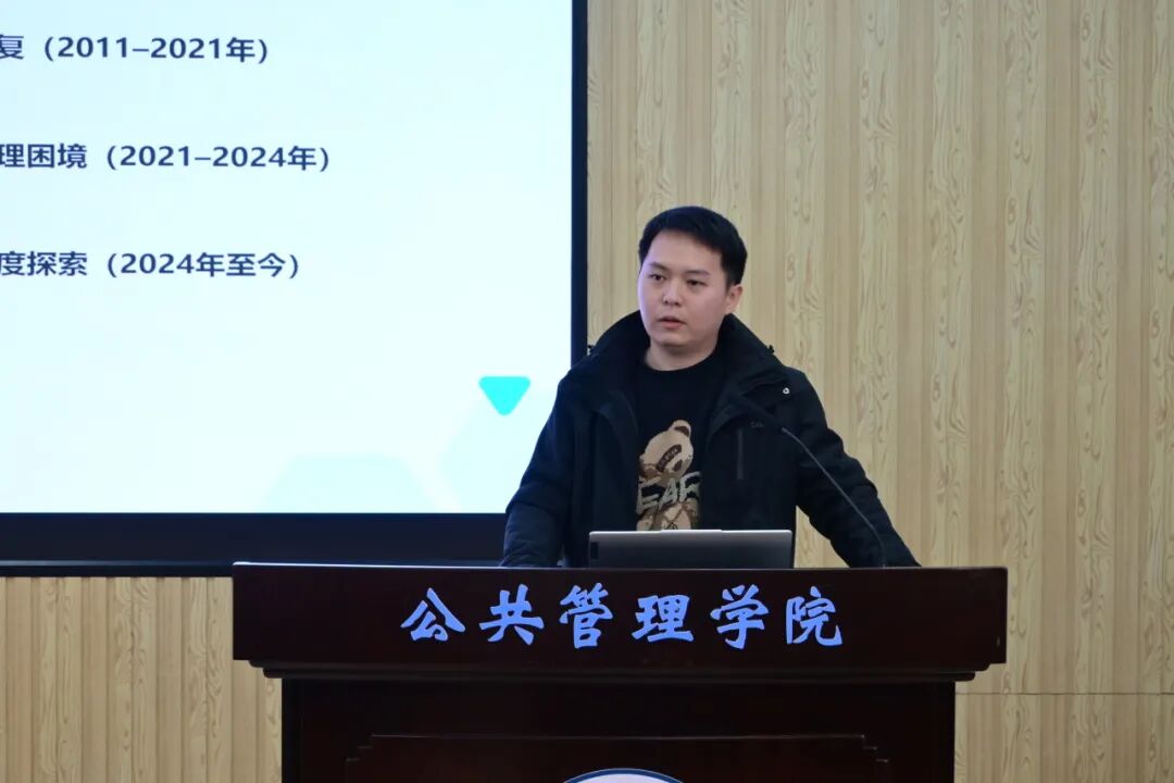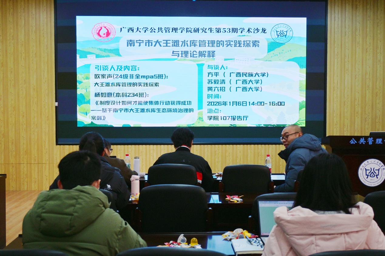 2026年1月6日下午,广西大学公共管理学院暨广西高校人文社会科学重点研究基地——区域社会治理创新研究中心第五十三期学术沙龙在学院107报告厅成功举行。本期沙龙聚焦“南宁市大王滩水库管理的实践探索与理论解释”主题,由24级非全日制硕士研究生欧家声、23级本科生杨如意担任引谈人,方平、苏毅清、黄六招三位老师担任与谈人。讲座深化了师生对相关领域的研究认知,吸引了全院众多师生参与。
